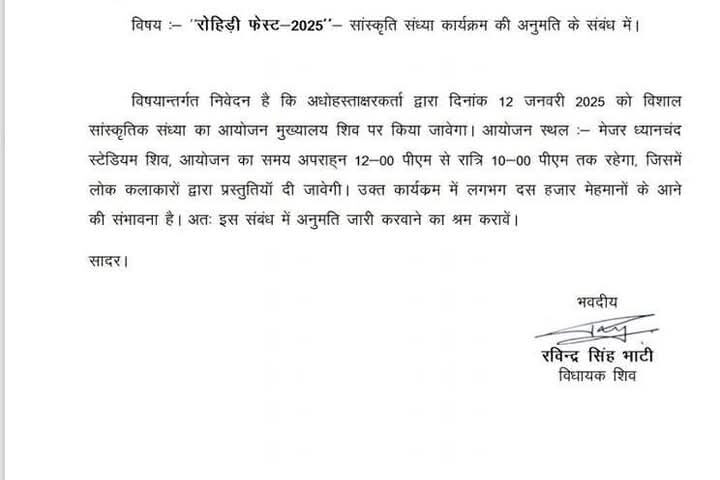 रोहिड़ी फेस्ट 2025 को शिव, राजस्थान में आयोजित करने के लिए विधायक रविंद्र सिंह भाटी ने अनुमति मांगी है। यह फेस्टिवल क्षेत्रीय संस्कृति, परंपरा और…