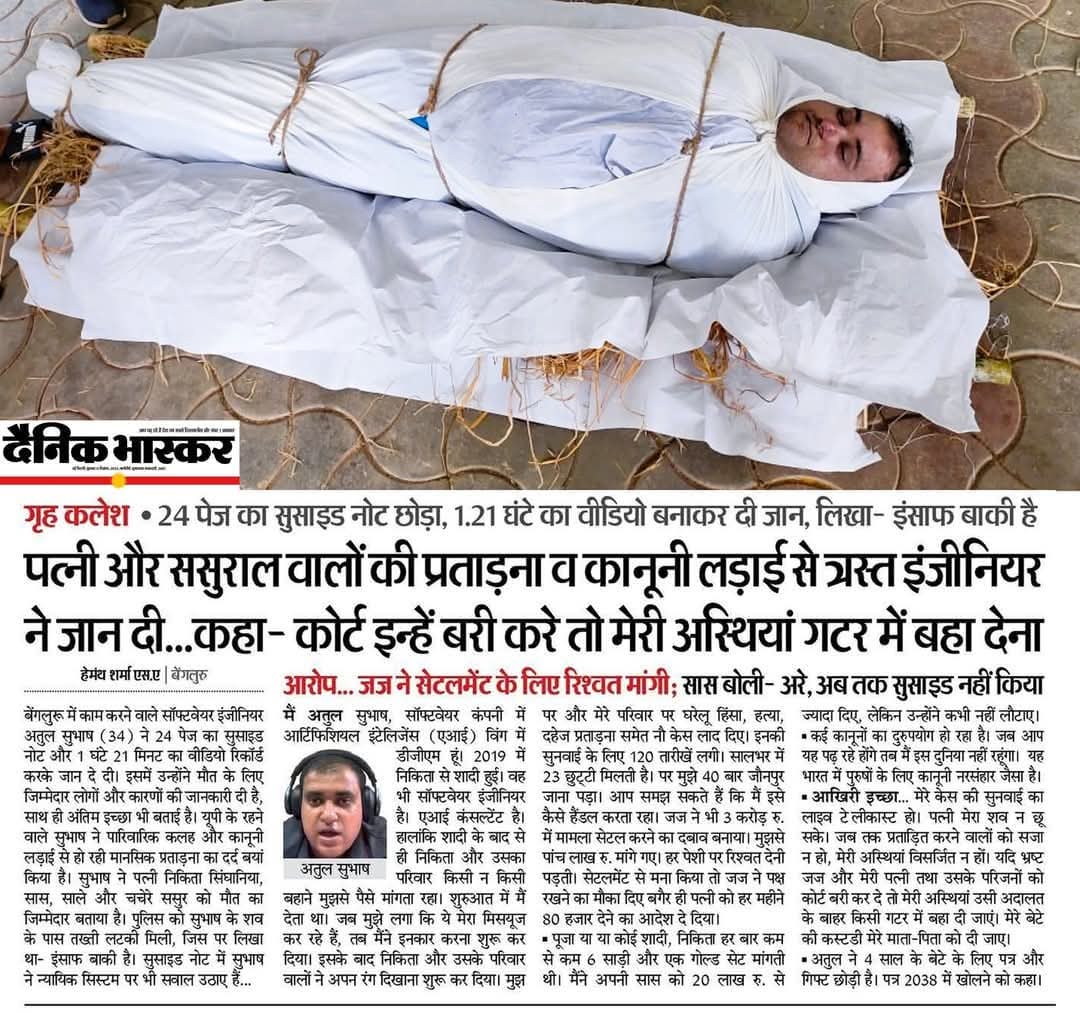 कल पूरे दिन ट्विटर पर अतुल सुभाष का नाम ट्रेंड करता रहा। बैंगलोर अतुल सुभाष जो महिंद्रा ऑटो में ai इंजीनियर के रूप में काम करते थे ने 24 पन्नों का सुसाइड नोट लिखकर और 90 मिनिट का डिटेल्ड वीडियो बनाकर कई हफ्तों की तैयारी के बाद सुसाइड कमिट कर लिया।अतुल की शादी जौनपुर निवासी निकिता सिंघानिया से हुई थी जो स्वयं एसेंचर में जॉब करती थी।