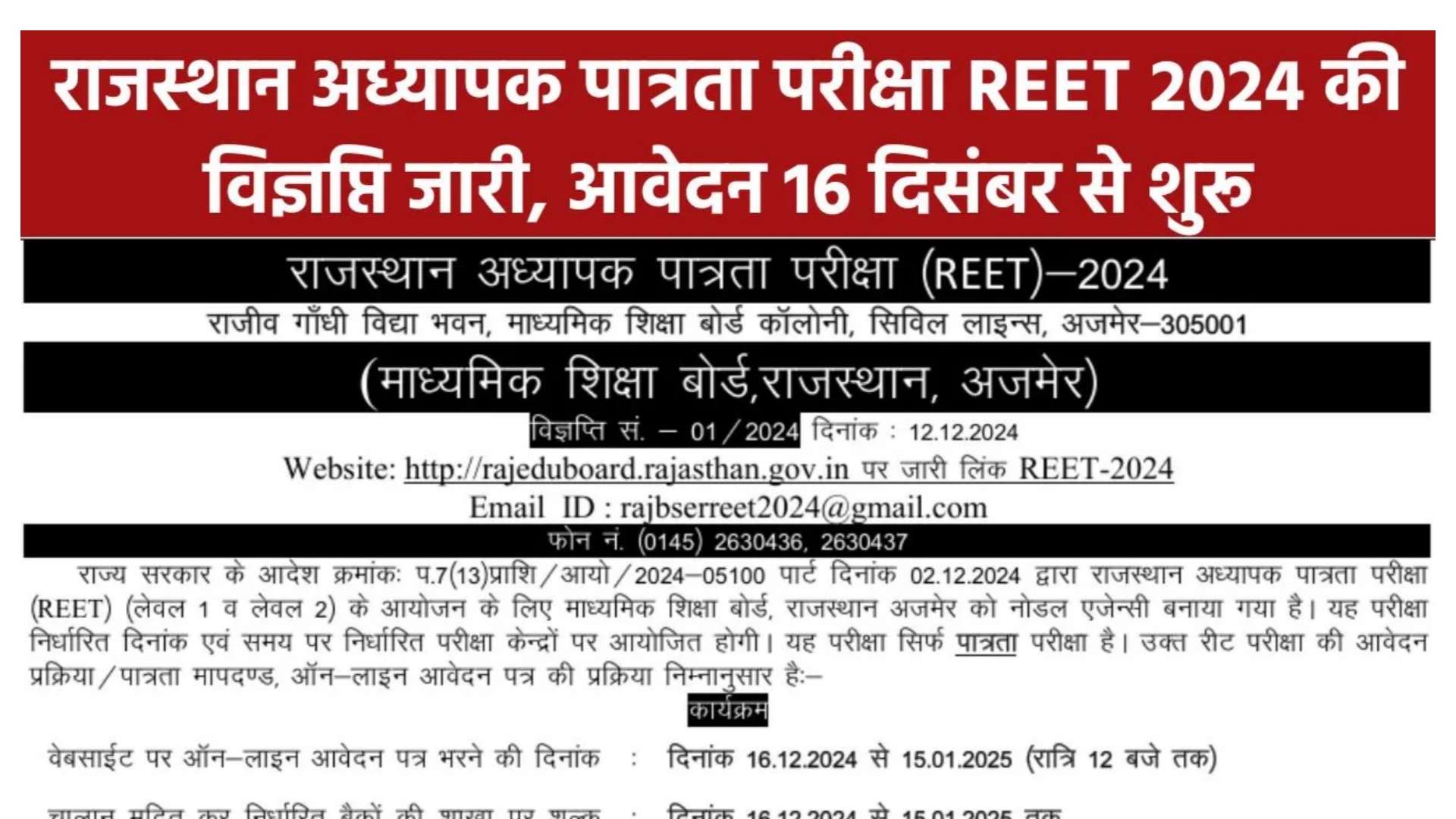 REET 2024 Notification Out Apply Online: राजस्थान अध्यापक पात्रता परीक्षा रीट 2024 की विज्ञप्ति जारी, आवेदन 16 दिसंबर से शुरू: राजस्थान अध्यापक पात्रता परीक्षा रीट 2024 का इंतजार कर रहे अभ्यर्थियों के लिए अच्छी खबर माध्यमिक शिक्षा बोर्ड अजमेर द्वारा रीट 2024 परीक्षा आयोजन करने के संबंध में आधिकारिक विज्ञप्ति जारी कर दी गई है। REET 2024 परीक्षा में भाग लेने हेतु ऑनलाइन आवेदन दिनांक 16 दिसंबर 2024 से शुरू होंगे जो की 15 जनवरी 2025 तक चलेंगे।