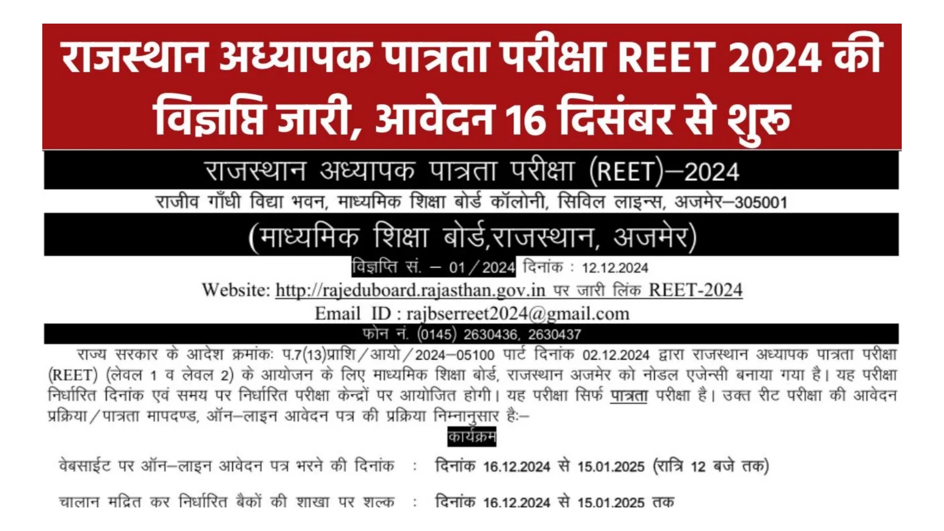 REET 2024 Notification Out Apply Online: राजस्थान अध्यापक पात्रता परीक्षा रीट 2024 की विज्ञप्ति जारी, आवेदन 16 दिसंबर से शुरू: राजस्थान अध्यापक पात्रता परीक्षा रीट 2024 का इंतजार कर रहे अभ्यर्थियों के लिए अच्छी खबर माध्यमिक शिक्षा बोर्ड अजमेर द्वारा रीट 2024 परीक्षा आयोजन करने के संबंध में आधिकारिक विज्ञप्ति जारी कर दी गई है। REET 2024 परीक्षा में भाग लेने हेतु ऑनलाइन आवेदन दिनांक 16 दिसंबर 2024 से शुरू होंगे जो की 15 जनवरी 2025 तक चलेंगे।