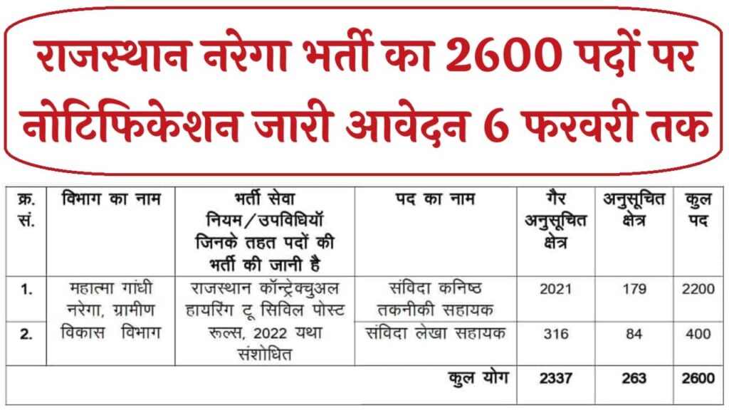 राजस्थान में सरकारी नौकरी की तलाश कर रहे युवाओं के लिए अच्छी खबर है राजस्थान में महात्मा गांधी नरेगा ग्रामीण विकास विभाग के लिए 2600 पदों पर भर्ती का नोटिफिकेशन जारी कर दिया है इस भर्ती का आयोजन राजस्थान कर्मचारी चयन बोर्ड द्वारा किया जा रहा है इसमें संविदा कनिष्ठ तकनीकी सहायक के 2200 पद और संविदा लेखा सहायक के 400 पद रखे गए हैं।